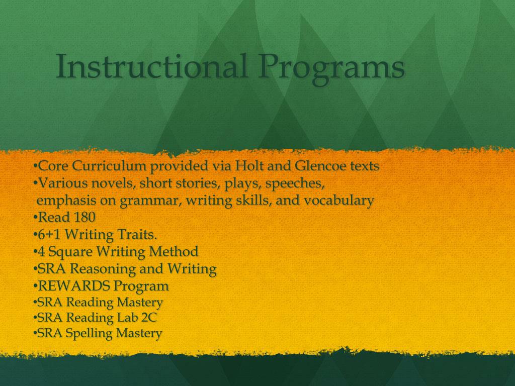 Instructional Programs Core Curriculum provided via Holt and Glencoe texts Various novels, short stories, plays, speeches, emphasis on grammar, writing skills, and vocabulary Read 180 6+1 Writing Traits. 4 Square Writing Method SRA Reasoning and Writing REWARDS Program SRA Reading Mastery SRA Reading Lab 2C SRA Spelling Mastery