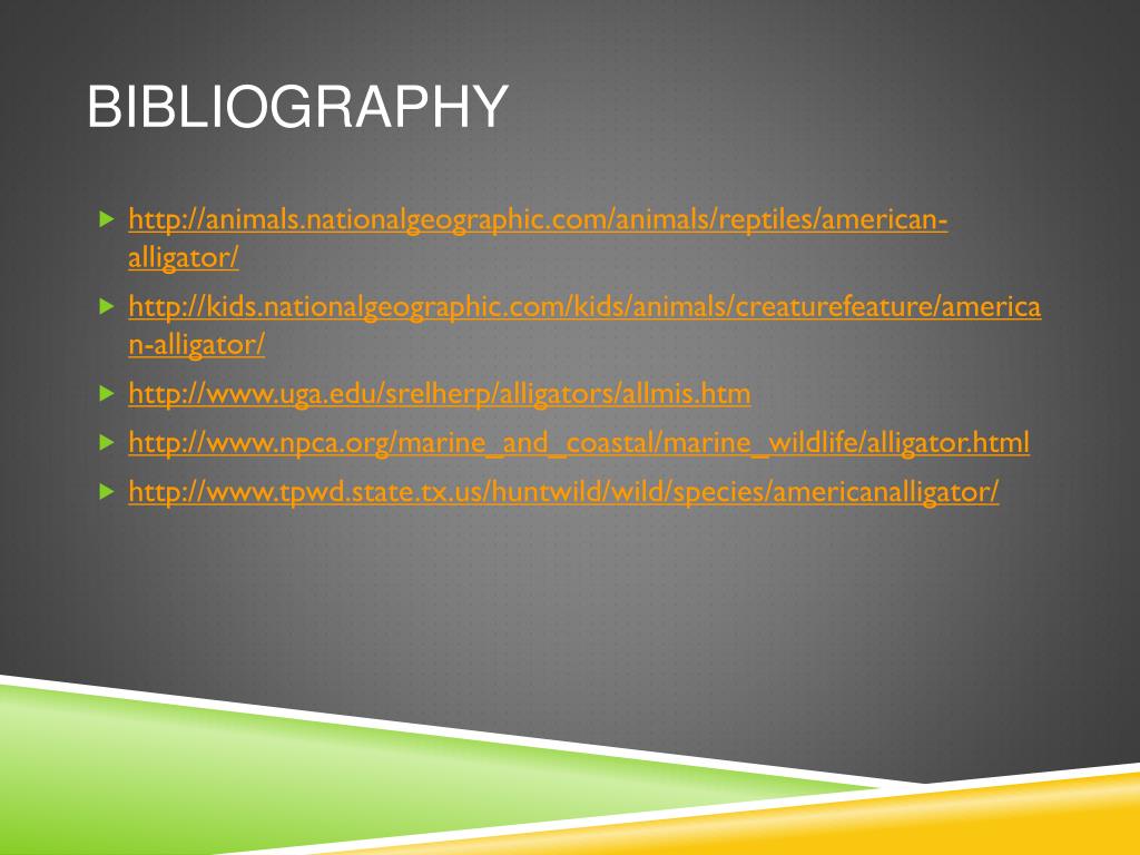 Bibliography • http://animals.nationalgeographic.com/animals/reptiles/american-alligator/ • http://kids.nationalgeographic.com/kids/animals/creaturefeature/american-alligator/ • http://www.uga.edu/srelherp/alligators/allmis.htm • http://www.npca.org/marine_and_coastal/marine_wildlife/alligator.html • http://www.tpwd.state.tx.us/huntwild/wild/species/americanalligator/
