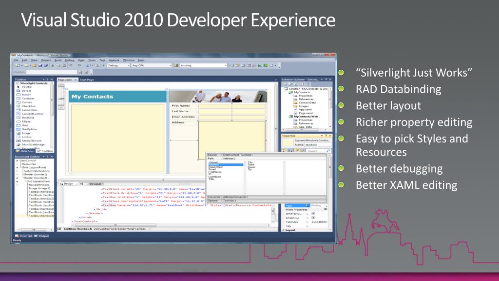 Visual Studio 2010 Developer Experience • “Silverlight Just Works” • RAD Databinding • Better layout • Richer property editing • Easy to pick Styles and Resources • Better debugging • Better XAML editing