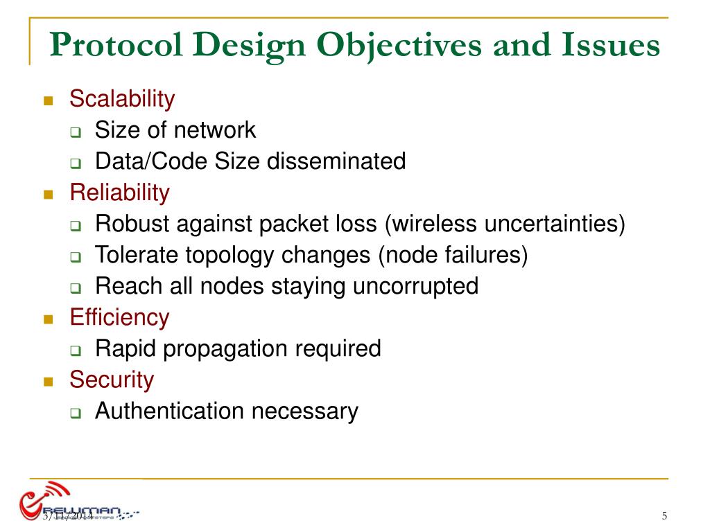 Protocol Design Objectives and Issues • Scalability • Size of network • Data/Code Size disseminated • Reliability • Robust against packet loss (wireless uncertainties) • Tolerate topology changes (node failures) • Reach all nodes staying uncorrupted • Efficiency • Rapid propagation required • Security • Authentication necessary