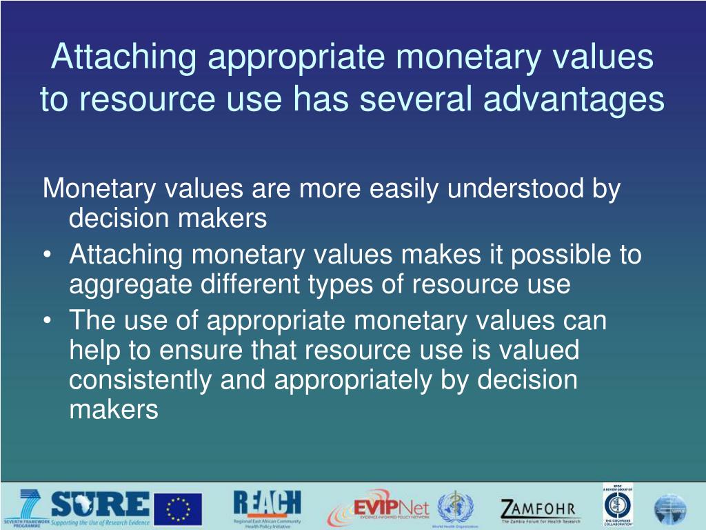 Attaching appropriate monetary values to resource use has several advantages Monetary values are more easily understood by decision makers • Attaching monetary values makes it possible to aggregate different types of resource use • The use of appropriate monetary values can help to ensure that resource use is valued consistently and appropriately by decision makers