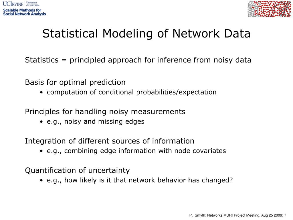 Scalable Methods for the Analysis of Network-Based Data MURI Project: University of California, Irvine Project Meeting August 25 th 2009 Principal Investigator: Padhraic Smyth . Goals for Today’s Meeting. Introductions and brief review of our project Technical presentations and discussion