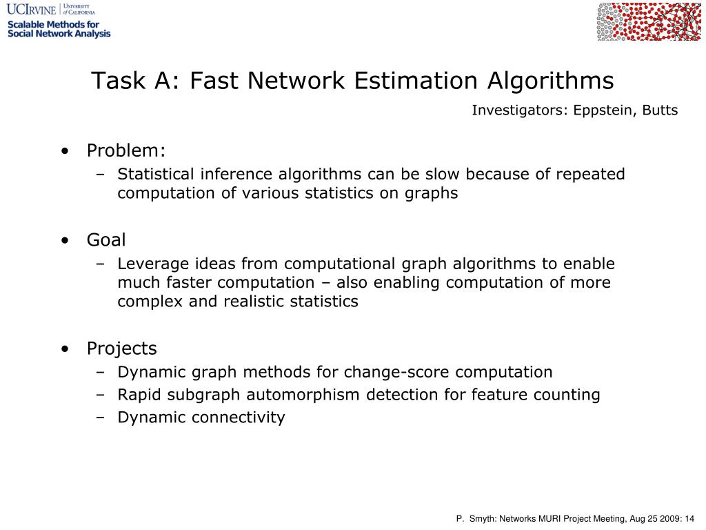 Task A: Fast Network Estimation Algorithms Investigators: Eppstein, Butts • Problem: • Statistical inference algorithms can be slow because of repeated computation of various statistics on graphs • Goal • Leverage ideas from computational graph algorithms to enable much faster computation – also enabling computation of more complex and realistic statistics • Projects • Dynamic graph methods for change-score computation • Rapid subgraph automorphism detection for feature counting • Dynamic connectivity