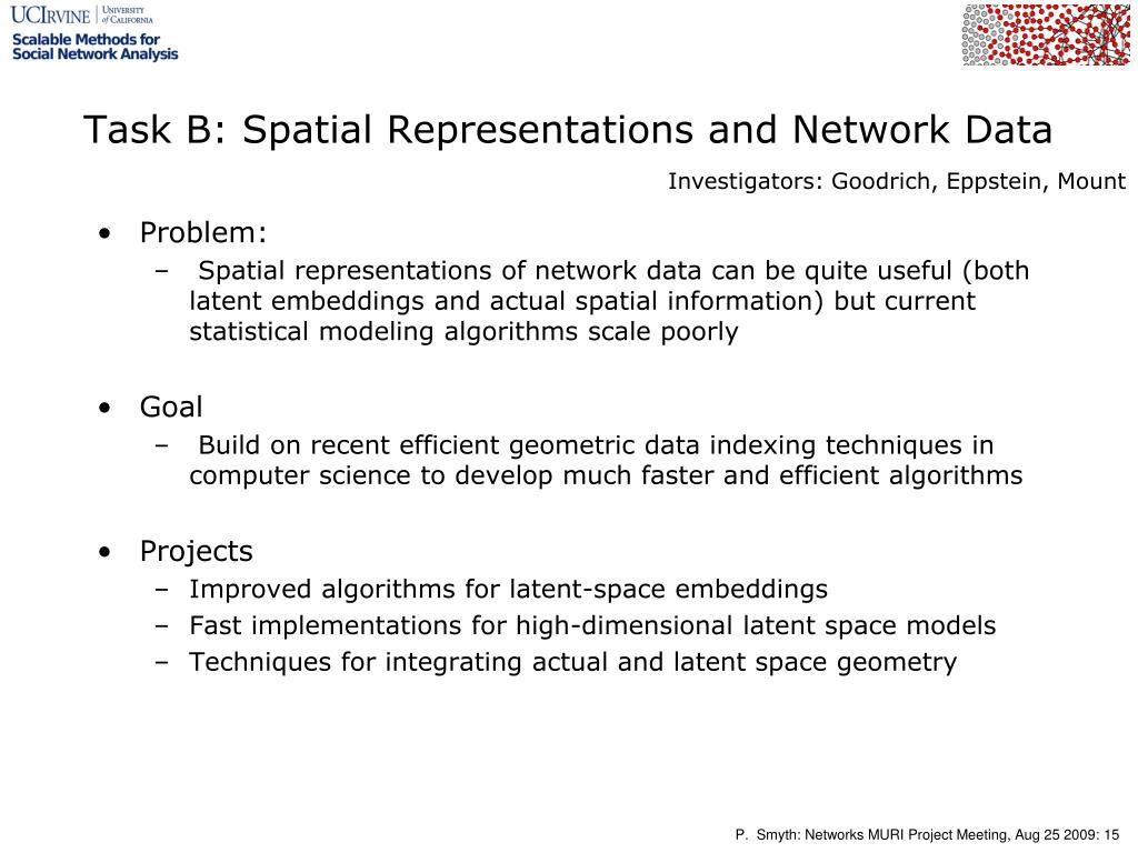Task B: Spatial Representations and Network Data Investigators: Goodrich, Eppstein, Mount • Problem: • Spatial representations of network data can be quite useful (both latent embeddings and actual spatial information) but current statistical modeling algorithms scale poorly • Goal • Build on recent efficient geometric data indexing techniques in computer science to develop much faster and efficient algorithms • Projects • Improved algorithms for latent-space embeddings • Fast implementations for high-dimensional latent space models • Techniques for integrating actual and latent space geometry