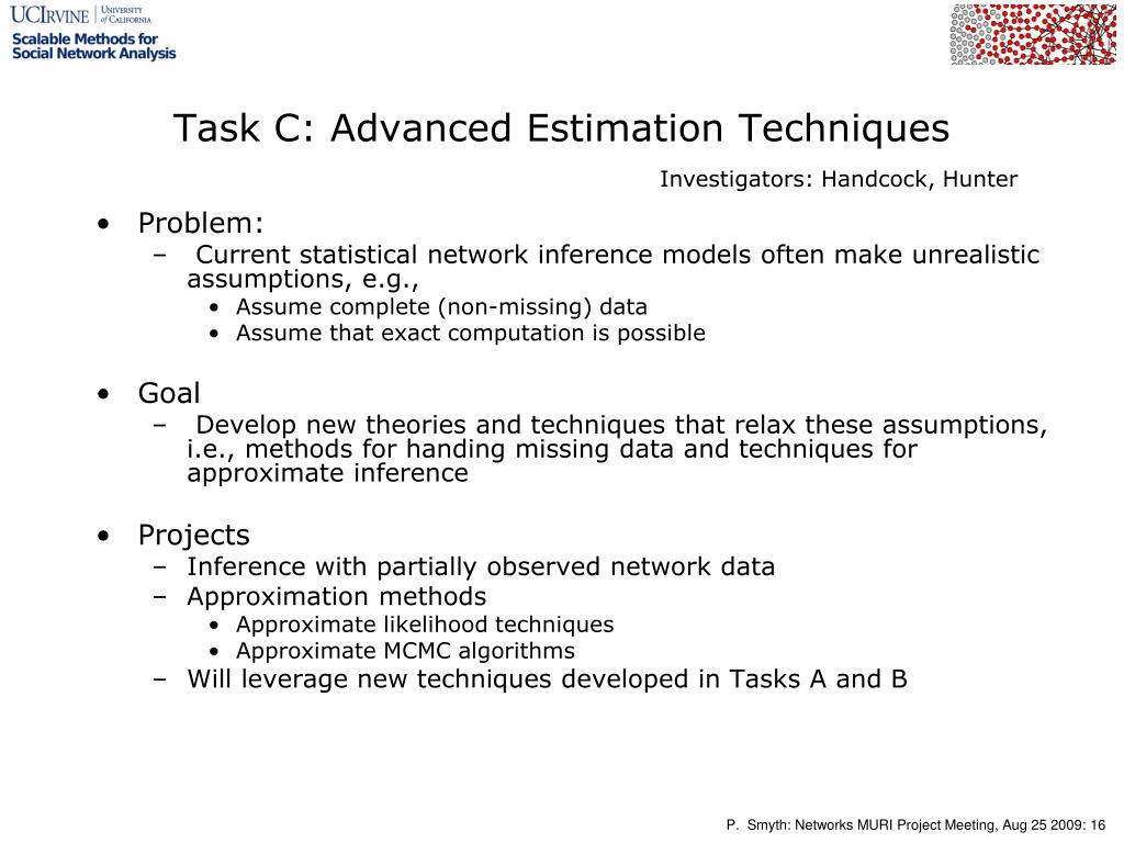 Task C: Advanced Estimation Techniques Investigators: Handcock, Hunter • Problem: • Current statistical network inference models often make unrealistic assumptions, e.g., • Assume complete (non-missing) data • Assume that exact computation is possible • Goal • Develop new theories and techniques that relax these assumptions, i.e., methods for handing missing data and techniques for approximate inference • Projects • Inference with partially observed network data • Approximation methods • Approximate likelihood techniques • Approximate MCMC algorithms • Will leverage new techniques developed in Tasks A and B