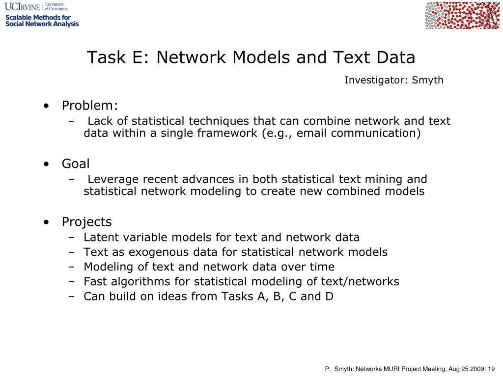 Task E: Network Models and Text Data Investigator: Smyth • Problem: • Lack of statistical techniques that can combine network and text data within a single framework (e.g., email communication) • Goal • Leverage recent advances in both statistical text mining and statistical network modeling to create new combined models • Projects • Latent variable models for text and network data • Text as exogenous data for statistical network models • Modeling of text and network data over time • Fast algorithms for statistical modeling of text/networks • Can build on ideas from Tasks A, B, C and D