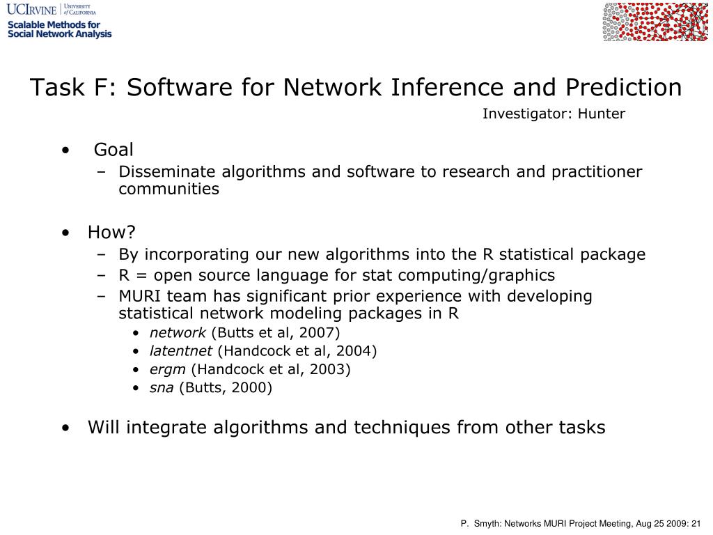 Task F: Software for Network Inference and Prediction Investigator: Hunter • Goal • Disseminate algorithms and software to research and practitioner communities • How? • By incorporating our new algorithms into the R statistical package • R = open source language for stat computing/graphics • MURI team has significant prior experience with developing statistical network modeling packages in R • network (Butts et al, 2007) • latentnet (Handcock et al, 2004) • ergm(Handcock et al, 2003) • sna (Butts, 2000) • Will integrate algorithms and techniques from other tasks