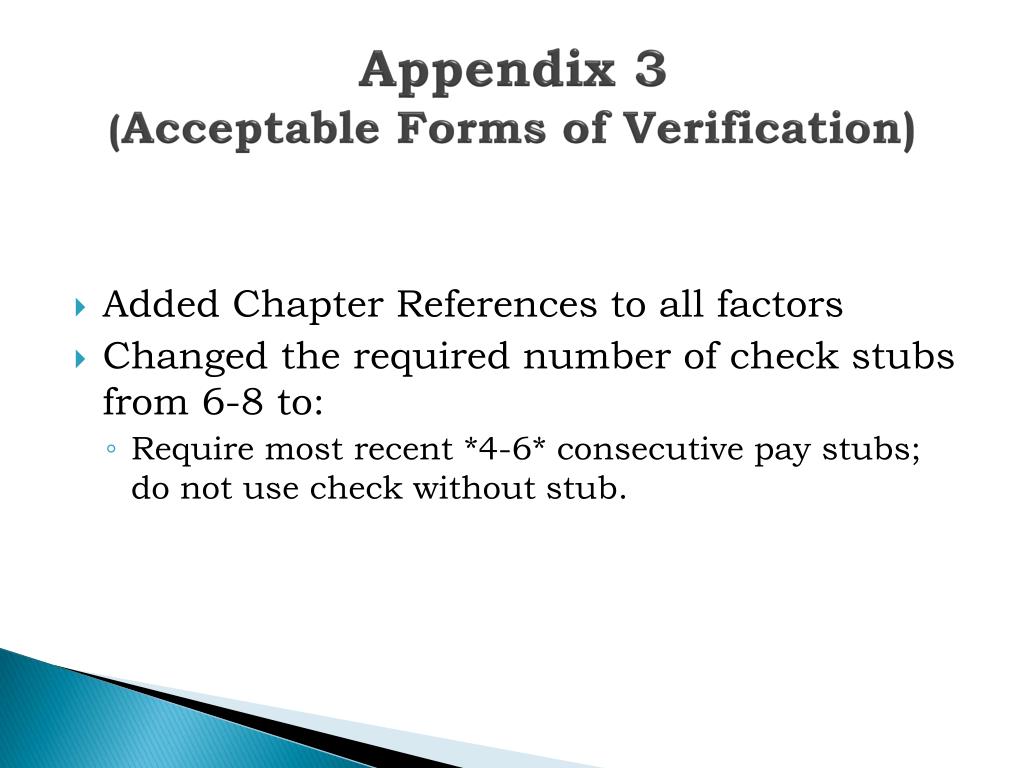 Appendix 3(Acceptable Forms of Verification) • Added Chapter References to all factors • Changed the required number of check stubs from 6-8 to: • Require most recent *4-6* consecutive pay stubs; do not use check without stub.