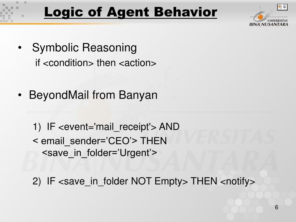 Logic of Agent Behavior • Symbolic Reasoning if <condition> then <action> • BeyondMail from Banyan 1) IF <event='mail_receipt'> AND < email_sender=’CEO’> THEN <save_in_folder=’Urgent’> 2) IF <save_in_folder NOT Empty> THEN <notify>
