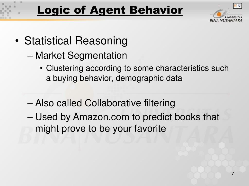 Logic of Agent Behavior • Statistical Reasoning • Market Segmentation • Clustering according to some characteristics such a buying behavior, demographic data • Also called Collaborative filtering • Used by Amazon.com to predict books that might prove to be your favorite