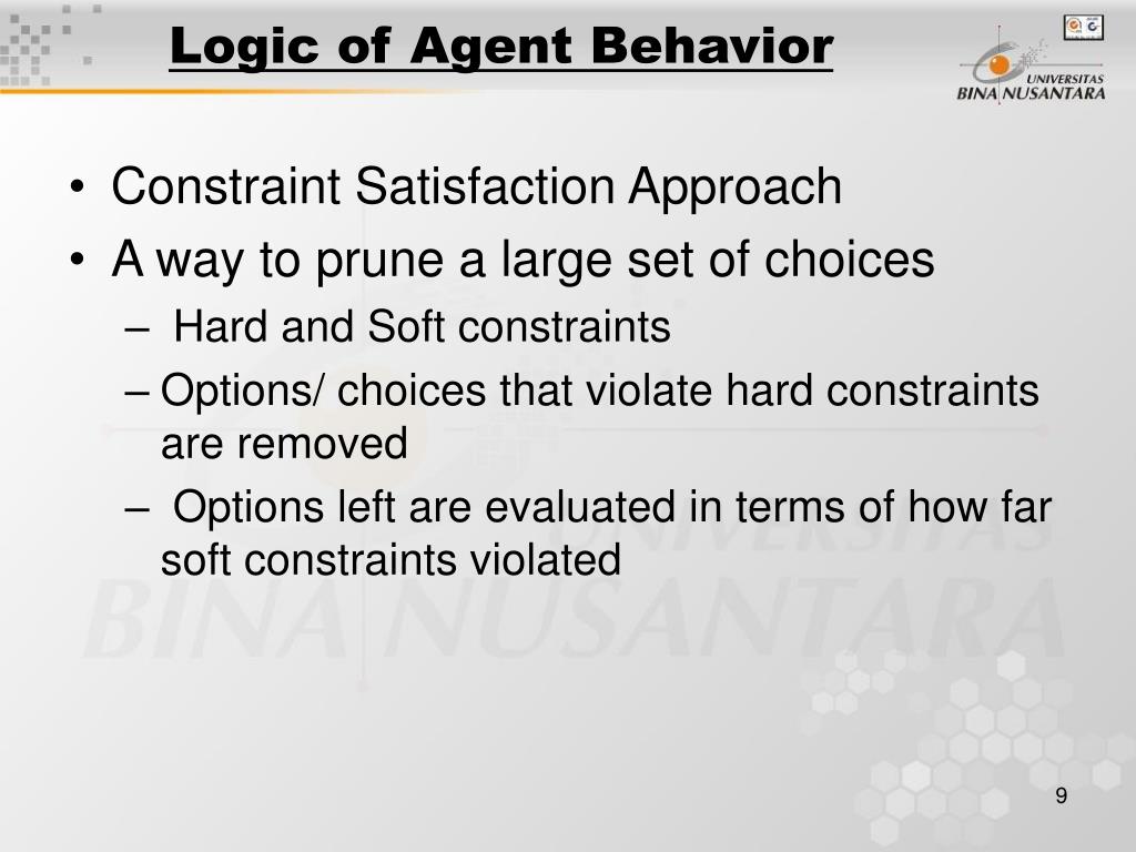 Logic of Agent Behavior • Constraint Satisfaction Approach • A way to prune a large set of choices • Hard and Soft constraints • Options/ choices that violate hard constraints are removed • Options left are evaluated in terms of how far soft constraints violated