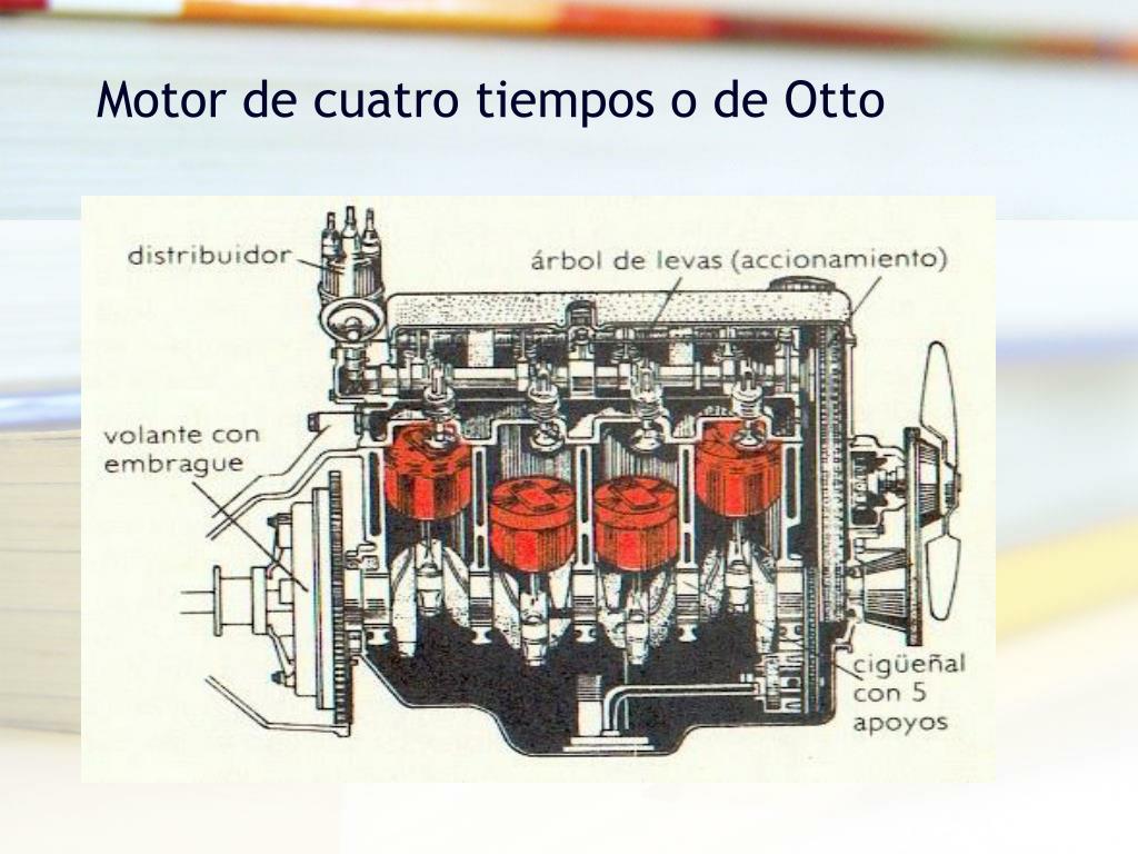 Motor de 4 tiempos • Motor que se rige por el ciclo de Otto, el pistón hace cuatro carreras lo que produce dos vueltas completas del cigüeñal para completar el ciclo termodinámico de combustión. • Los cuatro tiempos son: 1)Admisión: el descenso del pistón aspira la mezcla de aire-combustible, la que entra por la válvula de admisión.