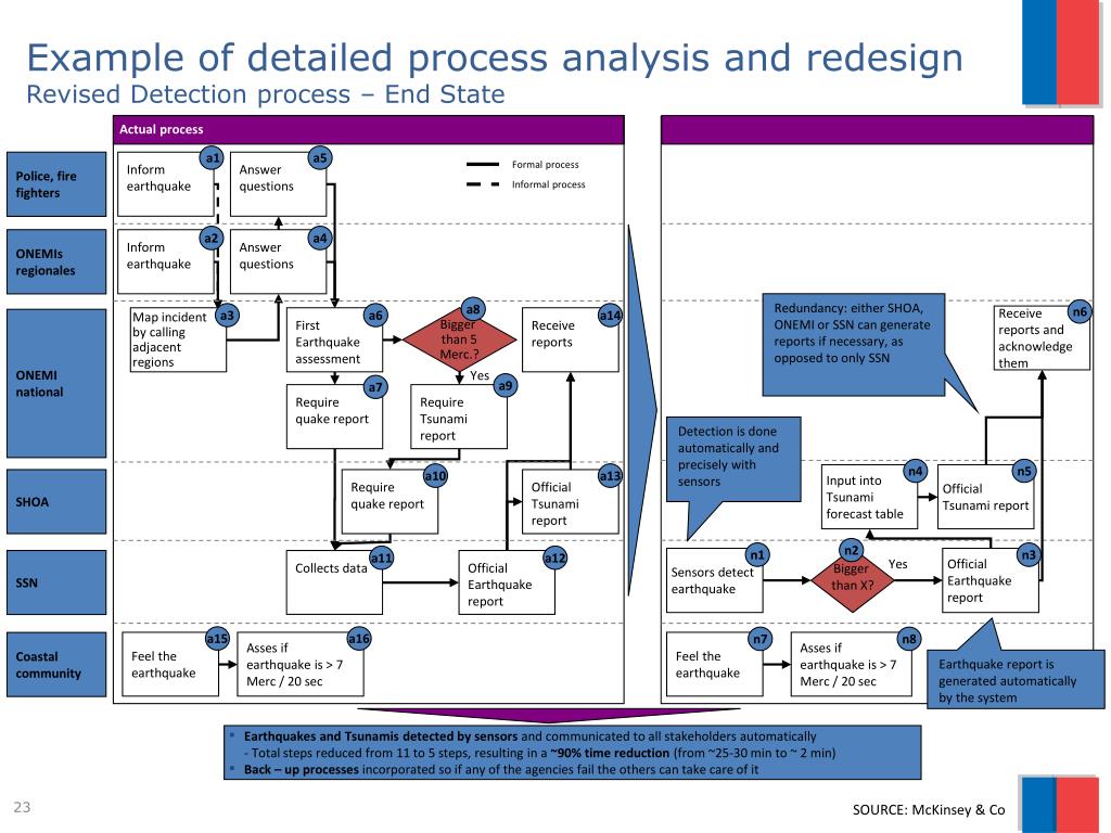 Formal process Informal process Example of detailed process analysis and redesign Revised Detection process – End State Actual process a1 a5 Police, fire fighters Inform earthquake Answer questions a2 a4 Inform earthquake Answer questions ONEMIs regionales Redundancy: either SHOA, ONEMI or SSN can generate reports if necessary, as opposed to only SSN a8 n6 a3 a6 a14 Receive reports and acknowledge them Bigger than 5 Merc.? Map incident by calling adjacent regions First Earthquake assessment Receive reports ONEMI national Yes a9 a7 Require quake report Require Tsunami report Detection is done automatically and precisely with sensors n4 n5 a10 a13 Input into Tsunami forecast table Official Tsunami report SHOA Require quake report Official Tsunami report n2 n1 n3 a11 a12 Sensors detect earthquake Bigger than X? Official Earthquake report Collects data Official Earthquake report SSN Yes a15 a16 n7 n8 Feel the earthquake Asses if earthquake is > 7 Merc / 20 sec Feel the earthquake Asses if earthquake is > 7 Merc / 20 sec Coastal community Earthquake report is generated automatically by the system • Earthquakes and Tsunamis detected by sensors and communicated to all stakeholders automatically • - Total steps reduced from 11 to 5 steps, resulting in a ~90% time reduction (from ~25-30 min to ~ 2 min) • Back – up processes incorporated so if any of the agencies fail the others can take care of it SOURCE: McKinsey & Co