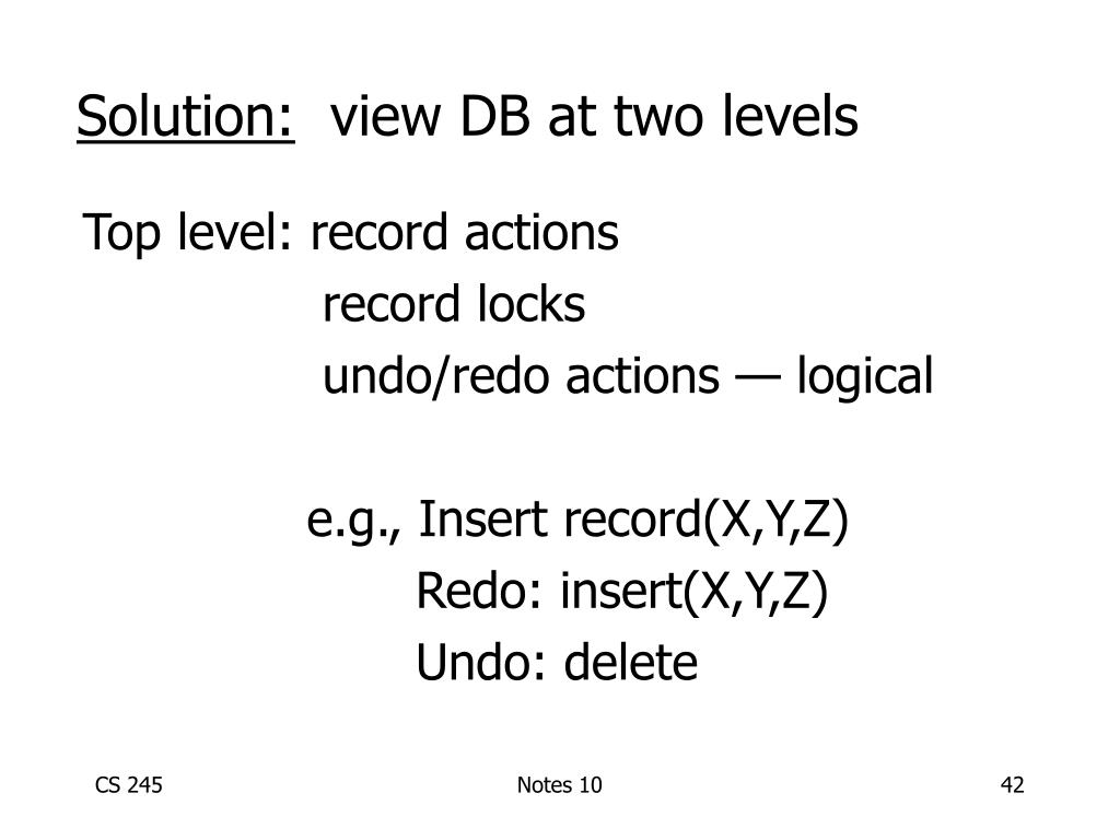 Solution: view DB at two levels Top level: record actions record locks undo/redo actions — logical e.g., Insert record(X,Y,Z) Redo: insert(X,Y,Z) Undo: delete Notes 10
