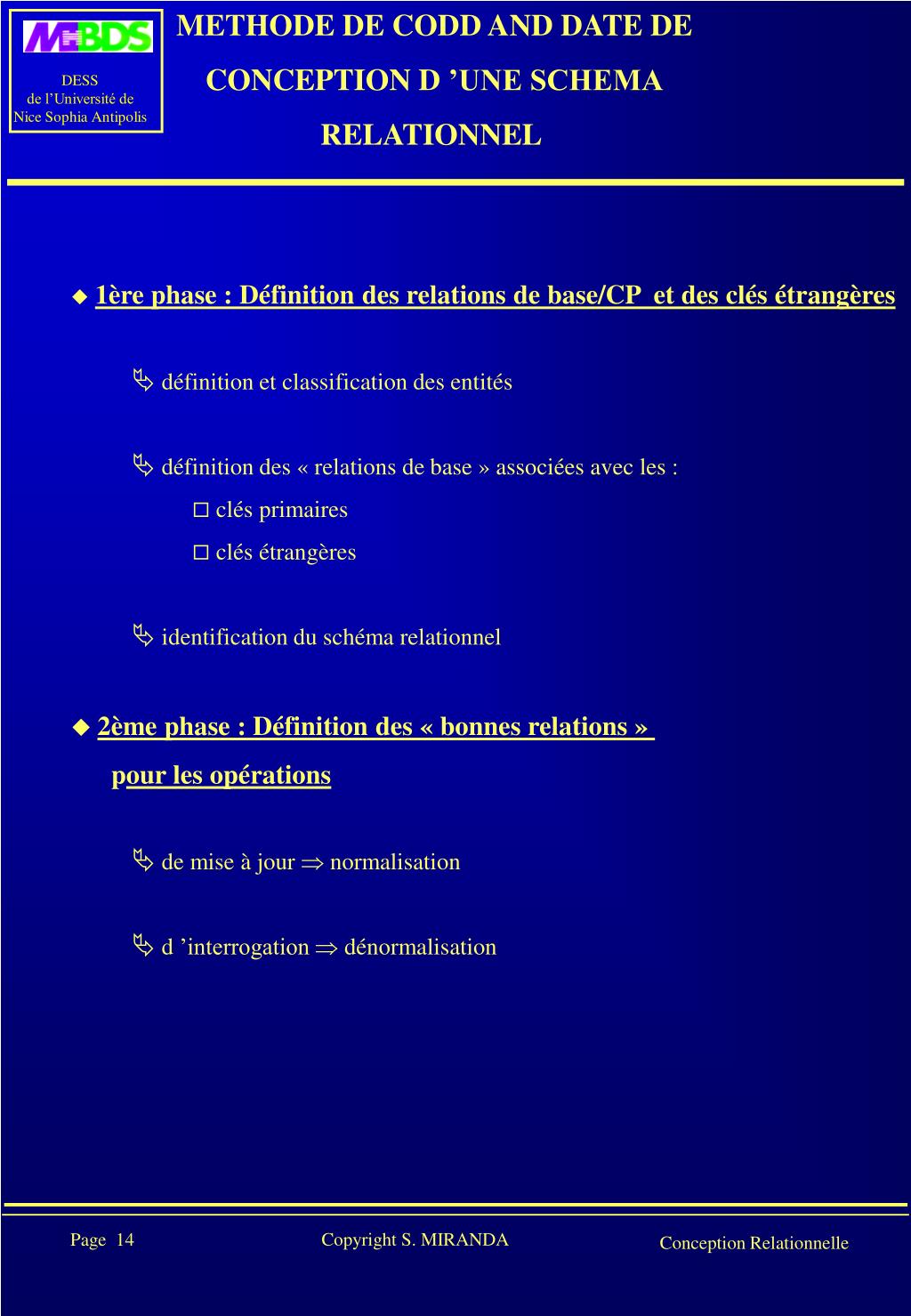 METHODE DE CONCEPTION D ’UN SCHEMA RELATIONNEL DE C. DATE & T. CODD. Professeur Serge MIRANDA Université de Nice Sophia Antipolis Directeur du Dess MBDS de l’ UNSA. Méthode pratique (utilisée dans le cours « Administrateur BD » chez IBM) Version Anglaise de cette méthode présentée dans :