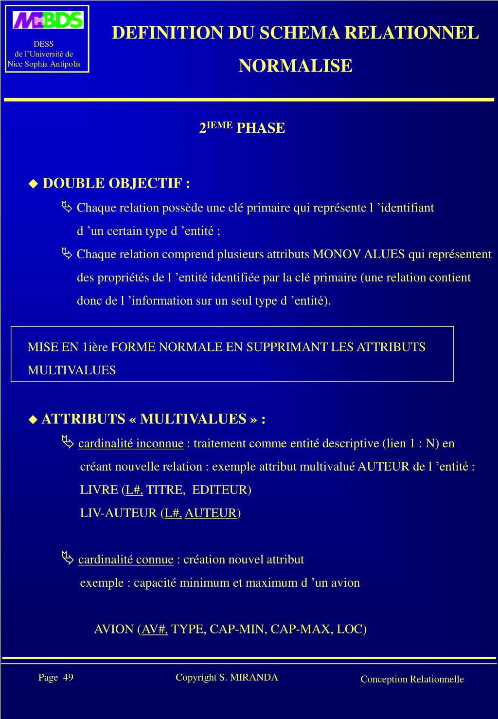 DEFINITION DU SCHEMA RELATIONNEL NORMALISE 2IEME PHASE • DOUBLE OBJECTIF : • Chaque relation possède une clé primaire qui représente l ’identifiant • d ’un certain type d ’entité ; • Chaque relation comprend plusieurs attributs MONOV ALUES qui représentent • des propriétés de l ’entité identifiée par la clé primaire (une relation contient • donc de l ’information sur un seul type d ’entité). • MISE EN 1ière FORME NORMALE EN SUPPRIMANT LES ATTRIBUTS • MULTIVALUES • ATTRIBUTS « MULTIVALUES » : • cardinalité inconnue : traitement comme entité descriptive (lien 1 : N) en • créant nouvelle relation : exemple attribut multivalué AUTEUR de l ’entité : • LIVRE (L#, TITRE, EDITEUR) • LIV-AUTEUR (L#,AUTEUR) • cardinalité connue : création nouvel attribut • exemple : capacité minimum et maximum d ’un avion • AVION (AV#, TYPE, CAP-MIN, CAP-MAX, LOC)