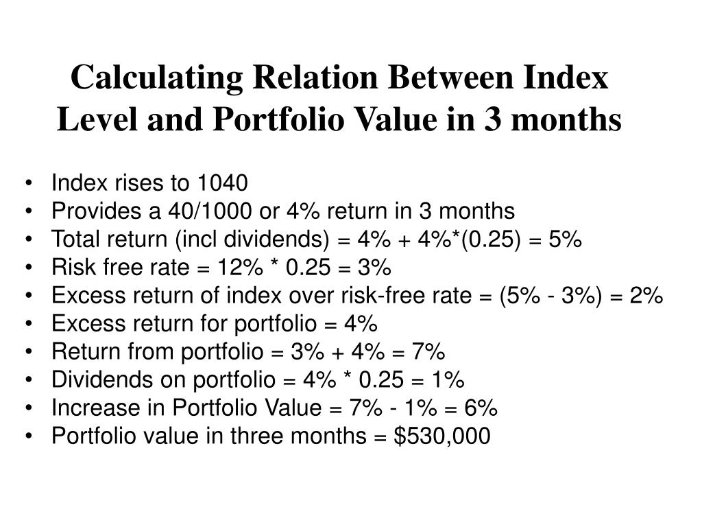 Calculating Relation Between Index Level and Portfolio Value in 3 months • Index rises to 1040 • Provides a 40/1000 or 4% return in 3 months • Total return (incl dividends) = 4% + 4%*(0.25) = 5% • Risk free rate = 12% * 0.25 = 3% • Excess return of index over risk-free rate = (5% - 3%) = 2% • Excess return for portfolio = 4% • Return from portfolio = 3% + 4% = 7% • Dividends on portfolio = 4% * 0.25 = 1% • Increase in Portfolio Value = 7% - 1% = 6% • Portfolio value in three months = $530,000