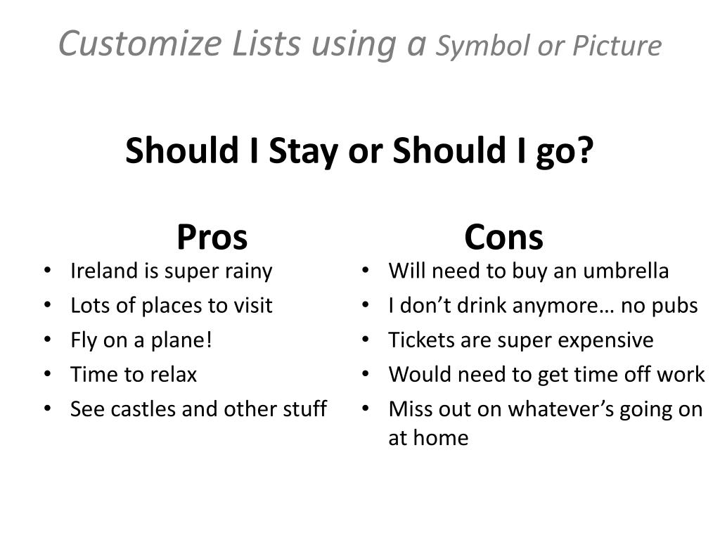 Customize Lists using a Symbol or Picture • Ireland is super rainy • Lots of places to visit • Fly on a plane! • Time to relax • See castles and other stuff • Will need to buy an umbrella • I don’t drink anymore… no pubs • Tickets are super expensive • Would need to get time off work • Miss out on whatever’s going on at home Should I Stay or Should I go? Pros Cons
