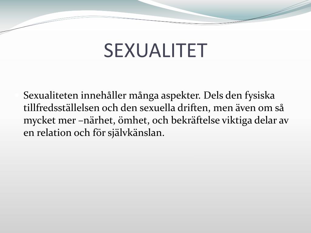 SEXUALITET • Sexualiteten innehåller många aspekter. Dels den fysiska tillfredsställelsen och den sexuella driften, men även om så mycket mer –närhet, ömhet, och bekräftelse viktiga delar av en relation och för självkänslan.