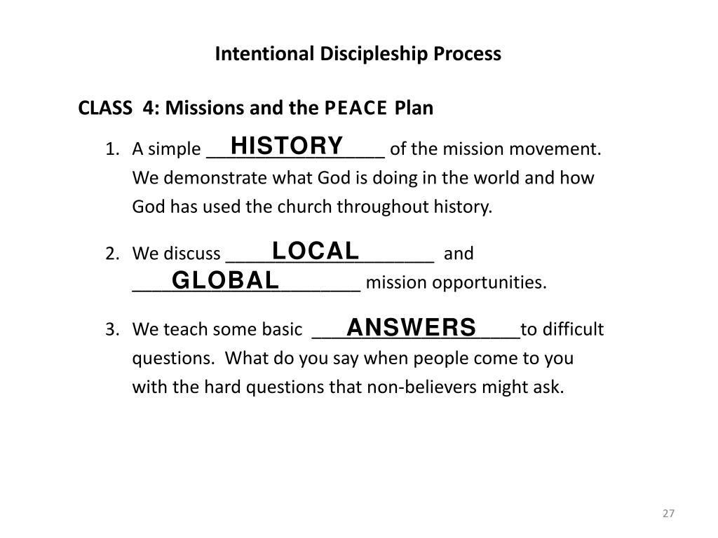 Intentional Discipleship Process CLASS 4: Missions and the PEACE Plan HISTORY A simple __________________ of the mission movement. We demonstrate what God is doing in the world and how God has used the church throughout history. We discuss _____________________ and _______________________ mission opportunities. We teach some basic _____________________to difficult questions. What do you say when people come to you with the hard questions that non-believers might ask. LOCAL GLOBAL ANSWERS