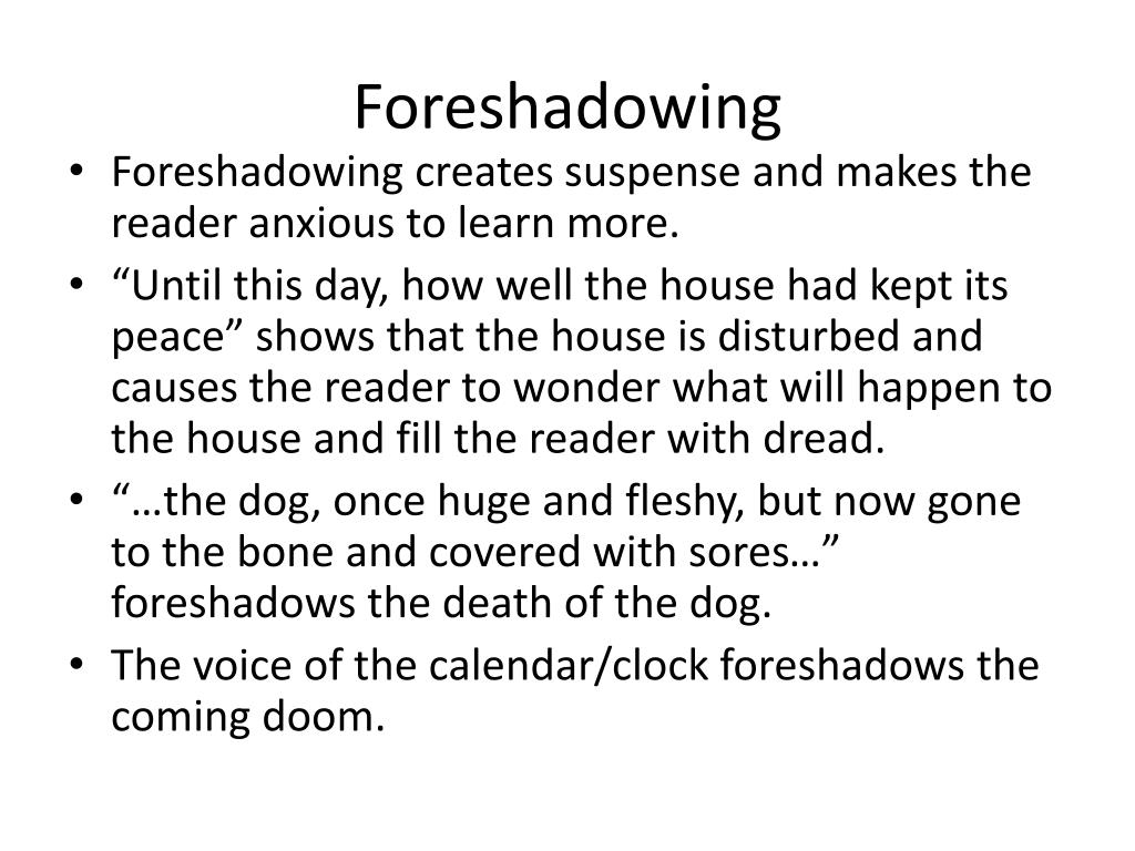 Foreshadowing • Foreshadowing creates suspense and makes the reader anxious to learn more. • “Until this day, how well the house had kept its peace” shows that the house is disturbed and causes the reader to wonder what will happen to the house and fill the reader with dread. • “…the dog, once huge and fleshy, but now gone to the bone and covered with sores…” foreshadows the death of the dog. • The voice of the calendar/clock foreshadows the coming doom.