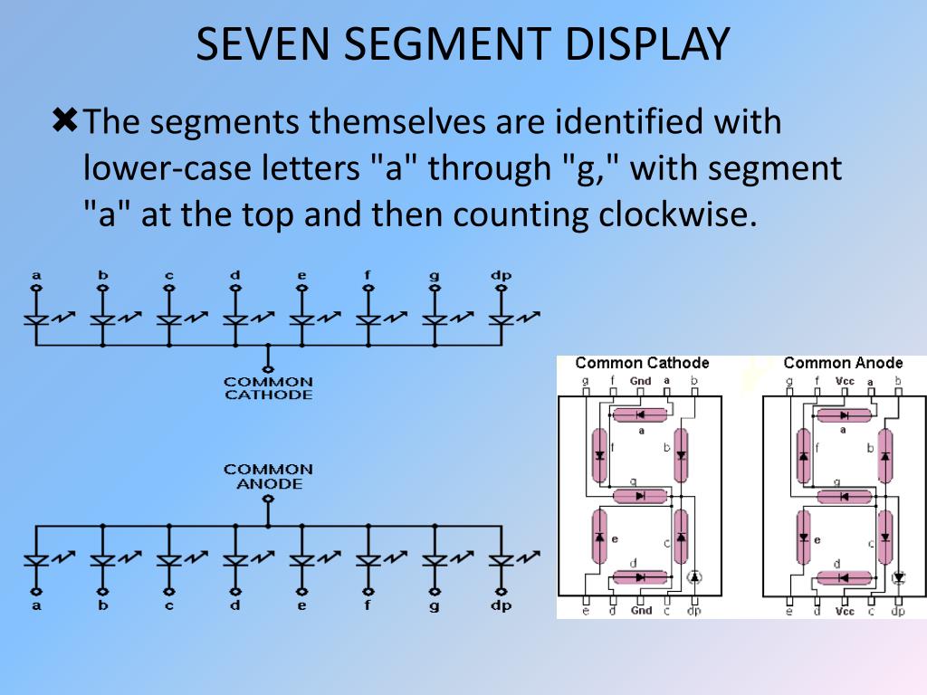SEVEN SEGMENT DISPLAY • The segments themselves are identified with lower-case letters "a" through "g," with segment "a" at the top and then counting clockwise.