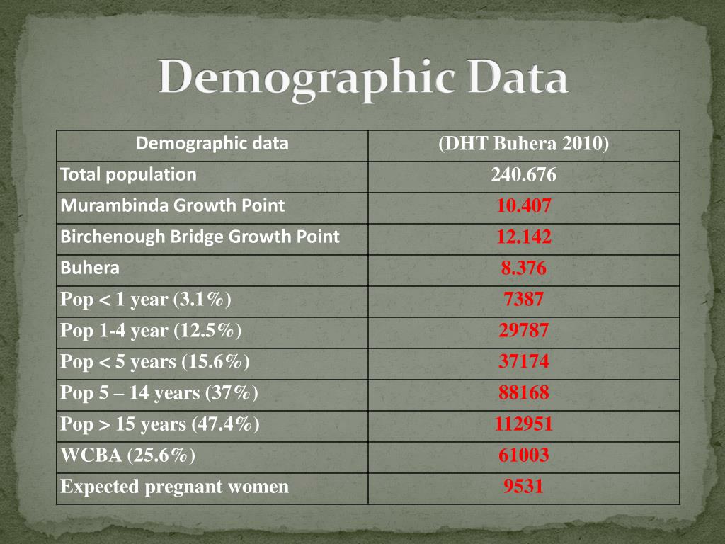 Buhera District. Demographic Data. Total Tuberculosis diagnosis per year in Buhera District. Notification rate of all TB cases per 100 000 population. Patients from outside Buhera District as from 2005 - 2011. Proportion of patient age groups.