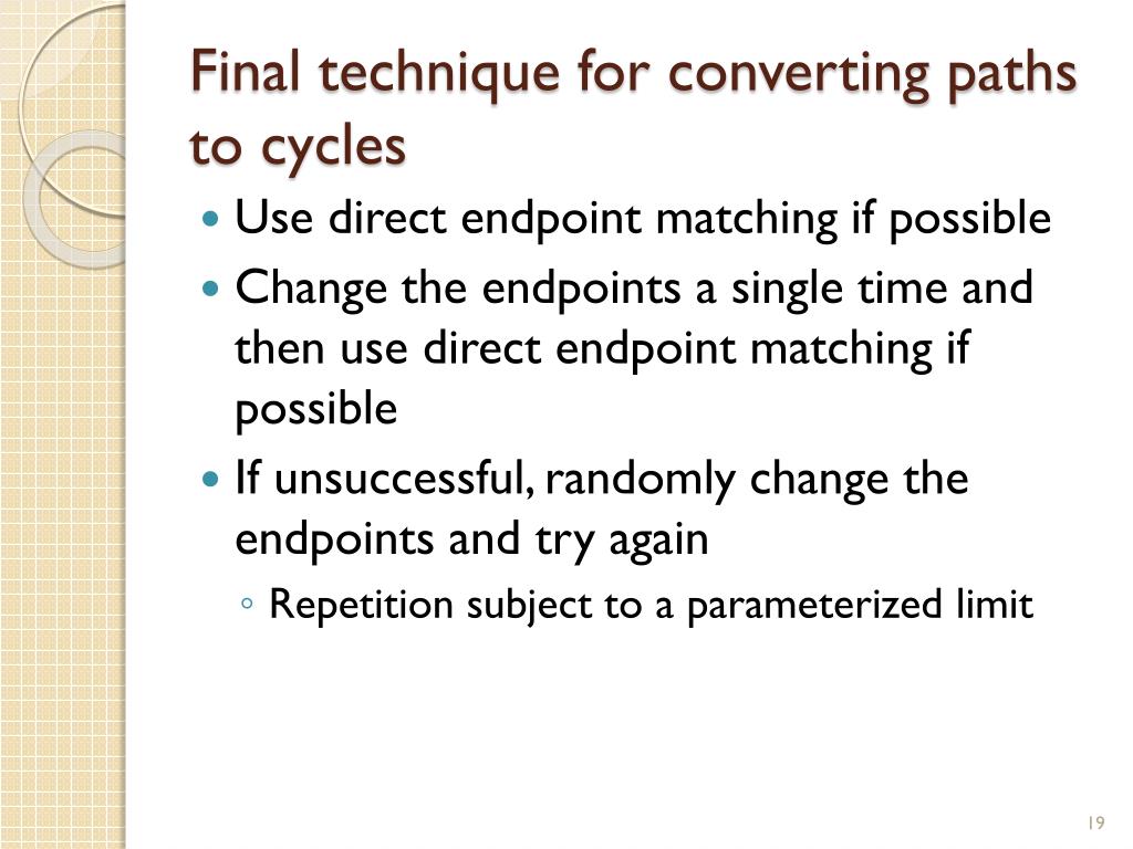 Final technique for converting paths to cycles • Use direct endpoint matching if possible • Change the endpoints a single time and then use direct endpoint matching if possible • If unsuccessful, randomly change the endpoints and try again • Repetition subject to a parameterized limit