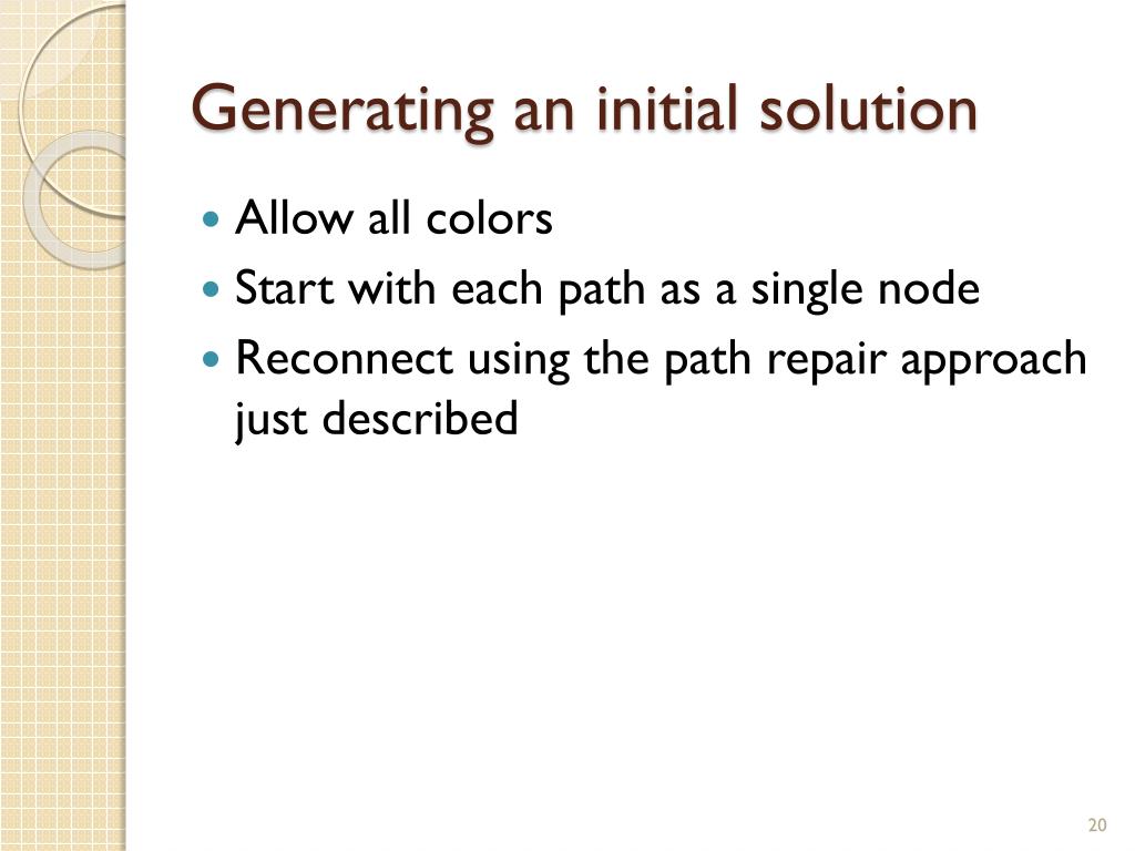Generating an initial solution • Allow all colors • Start with each path as a single node • Reconnect using the path repair approach just described