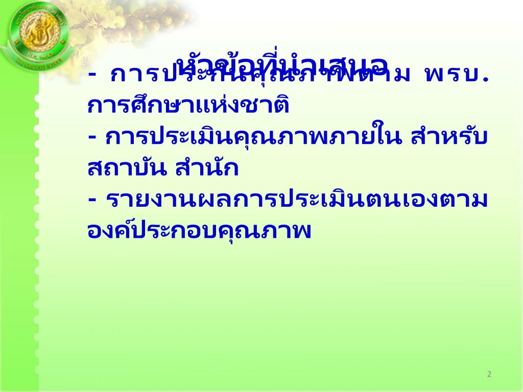หัวข้อที่นำเสนอ - การประกันคุณภาพตาม พรบ.การศึกษาแห่งชาติ - การประเมินคุณภาพภายใน สำหรับสถาบัน สำนัก - รายงานผลการประเมินตนเองตามองค์ประกอบคุณภาพ