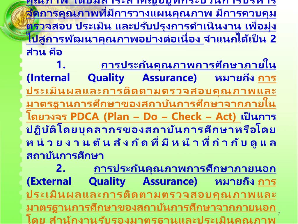 การประกันคุณภาพการศึกษาการประกันคุณภาพการศึกษา ตามพระราชบัญญัติการศึกษาแห่งชาติ พ.ศ.2542 พระราชบัญญัติการศึกษาแห่งชาติ พ.ศ.2542 แก้ไขเพิ่มเติม (ฉบับที่ 2) พ.ศ.2545 ได้กำหนดจุดมุ่งหมาย และหลักการของการจัดการศึกษา ที่ต้องมุ่งเน้นคุณภาพและมาตรฐานการศึกษา โดยกำหนดรายละเอียดไว้ในหมวด 6 มาตรฐานและการประกันคุณภาพการศึกษา มาตรา 47 กำหนดให้มีระบบการประกันคุณภาพการศึกษาเพื่อพัฒนาคุณภาพและมาตรฐานการศึกษาทุกระดับ ประกอบด้วย ระบบการประกันคุณภาพภายใน และระบบการประกันคุณภาพภายนอก และในวรรค 2 บัญญัติว่า ระบบ หลักเกณฑ์และวิธีการประกันคุณภาพการศึกษา ให้เป็นไปตามที่กำหนดในกฎกระทรวง