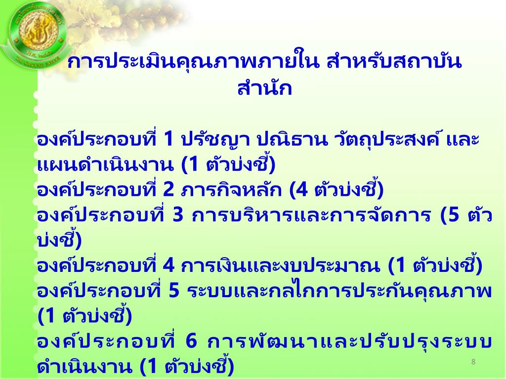 การประเมินคุณภาพภายใน สำหรับสถาบัน สำนัก องค์ประกอบที่ 1 ปรัชญา ปณิธาน วัตถุประสงค์ และแผนดำเนินงาน (1 ตัวบ่งชี้) องค์ประกอบที่ 2 ภารกิจหลัก (4 ตัวบ่งชี้) องค์ประกอบที่ 3 การบริหารและการจัดการ (5 ตัวบ่งชี้) องค์ประกอบที่ 4 การเงินและงบประมาณ (1 ตัวบ่งชี้) องค์ประกอบที่ 5 ระบบและกลไกการประกันคุณภาพ (1 ตัวบ่งชี้) องค์ประกอบที่ 6 การพัฒนาและปรับปรุงระบบดำเนินงาน (1 ตัวบ่งชี้)