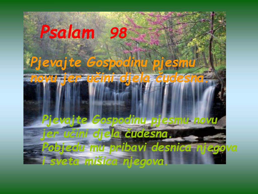 Psalam 98 Pjevajte Gospodinu pjesmu novu jer učini djela čudesna. Pjevajte Gospodinu pjesmu novu jer učini djela čudesna. Pobjedu mu pribavi desnica njegova i sveta mišica njegova.