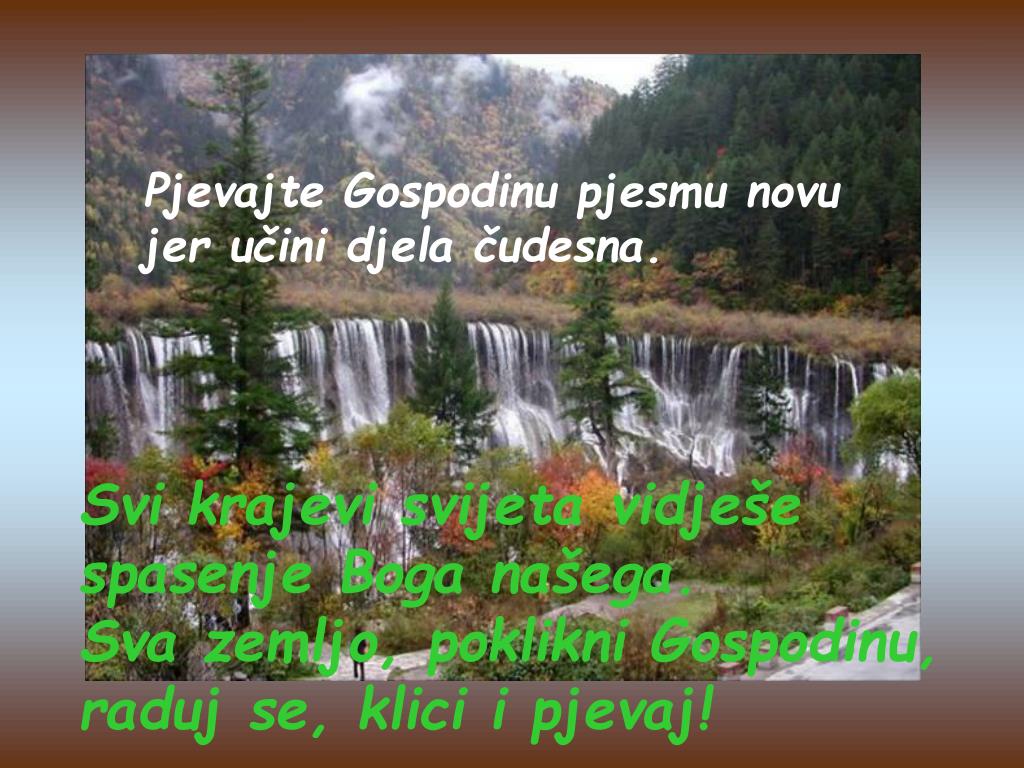 Pjevajte Gospodinu pjesmu novu jer učini djela čudesna. Gospodin obznani spasenje svoje, pred poganima pravednost objavi. Spomenu se dobrote i vjernosti prema domu Izraelovu.