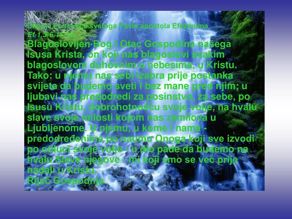 Čitanje Poslanice svetoga Pavla apostola Efežanima Ef 1,3-6.11-12 Blagoslovljen Bog i Otac Gospodina našega Isusa Krista, on koji nas blagoslovi svakim blagoslovom duhovnim u nebesima, u Kristu. Tako: u njemu nas sebi izabra prije postanka svijeta da budemo sveti i bez mane pred njim; u ljubavi nas predodredi za posinstvo, za sebe, po Isusu Kristu, dobrohotnošću svoje volje, na hvalu slave svoje milosti kojom nas zamilova u Ljubljenome. U njemu, u kome i nama - predodređenima po naumu Onoga koji sve izvodi po odluci svoje volje - u dio pade da budemo na hvalu Slave njegove - mi koji smo se već prije nadali u Kristu. Riječ Gospodnja.