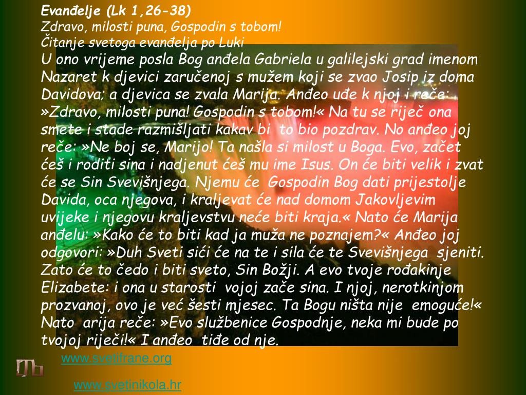Evanđelje (Lk 1,26-38) Zdravo, milosti puna, Gospodin s tobom! Čitanje svetoga evanđelja po Luki U ono vrijeme posla Bog anđela Gabriela u galilejski grad imenom Nazaret k djevici zaručenoj s mužem koji se zvao Josip iz doma Davidova; a djevica se zvala Marija. Anđeo uđe k njoj i reče: »Zdravo, milosti puna! Gospodin s tobom!« Na tu se riječ ona smete i stade razmišljati kakav bi to bio pozdrav. No anđeo joj reče: »Ne boj se, Marijo! Ta našla si milost u Boga. Evo, začet ćeš i roditi sina i nadjenut ćeš mu ime Isus. On će biti velik i zvat će se Sin Svevišnjega. Njemu će Gospodin Bog dati prijestolje Davida, oca njegova, i kraljevat će nad domom Jakovljevim uvijeke i njegovu kraljevstvu neće biti kraja.« Nato će Marija anđelu: »Kako će to biti kad ja muža ne poznajem?« Anđeo joj odgovori: »Duh Sveti sići će na te i sila će te Svevišnjega sjeniti. Zato će to čedo i biti sveto, Sin Božji. A evo tvoje rođakinje Elizabete: i ona u starosti vojoj zače sina. I njoj, nerotkinjom prozvanoj, ovo je već šesti mjesec. Ta Bogu ništa nije emoguće!« Nato arija reče: »Evo službenice Gospodnje, neka mi bude po tvojoj riječi!« I anđeo tiđe od nje. www.svetifrane.org www.svetinikola.hr