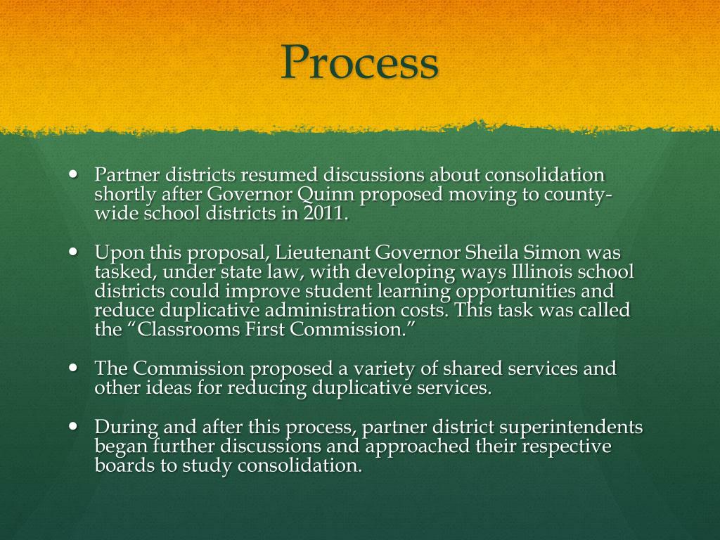 Process • Partner districts resumed discussions about consolidation shortly after Governor Quinn proposed moving to county- wide school districts in 2011. • Upon this proposal, Lieutenant Governor Sheila Simon was tasked, under state law, with developing ways Illinois school districts could improve student learning opportunities and reduce duplicative administration costs. This task was called the “Classrooms First Commission.” • The Commission proposed a variety of shared services and other ideas for reducing duplicative services. • During and after this process, partner district superintendents began further discussions and approached their respective boards to study consolidation.