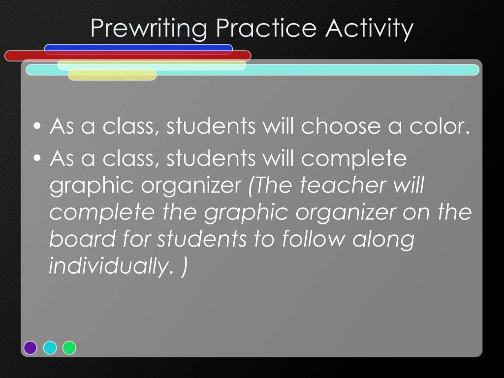 Prewriting Practice Activity • As a class, students will choose a color. • As a class, students will complete graphic organizer (The teacher will complete the graphic organizer on the board for students to follow along individually. )