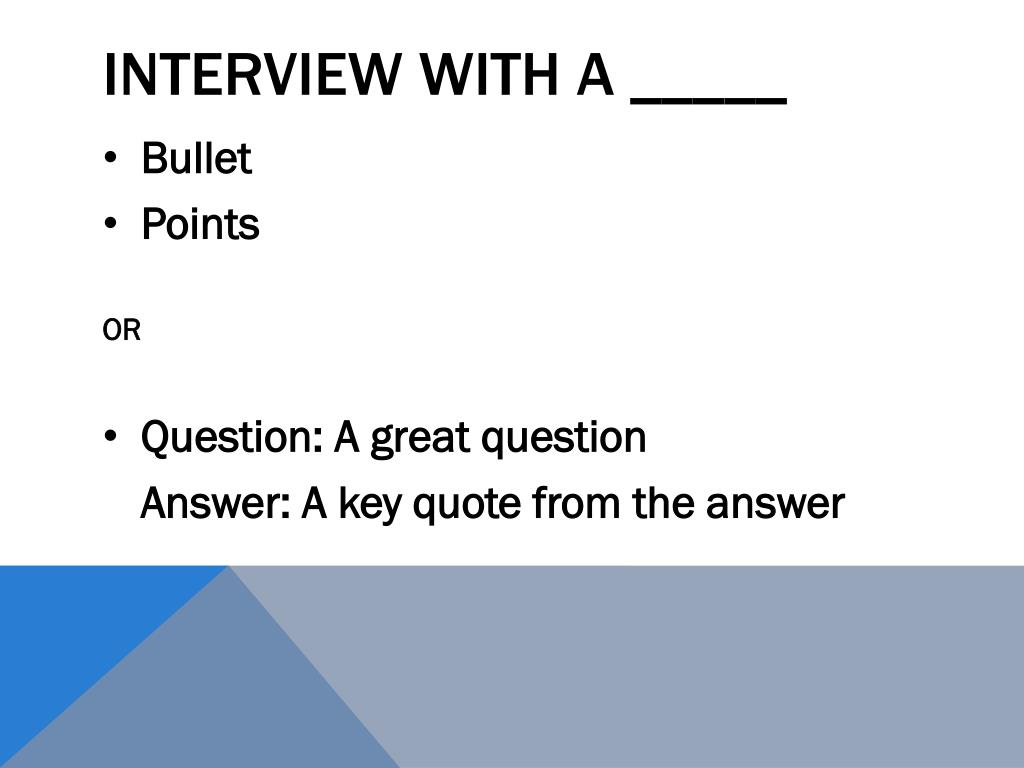 Interview with a _____ • Bullet • Points • OR • Question: A great question • Answer: A key quote from the answer