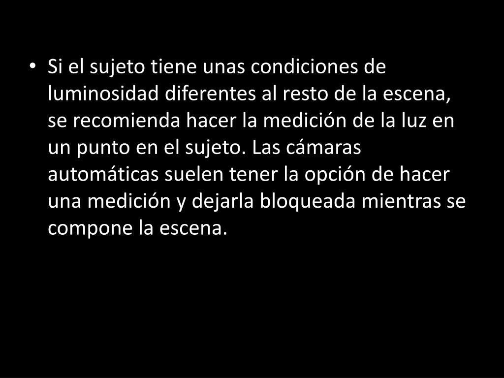 Si el sujeto tiene unas condiciones de luminosidad diferentes al resto de la escena, se recomienda hacer la medición de la luz en un punto en el sujeto. Las cámaras automáticas suelen tener la opción de hacer una medición y dejarla bloqueada mientras se compone la escena.