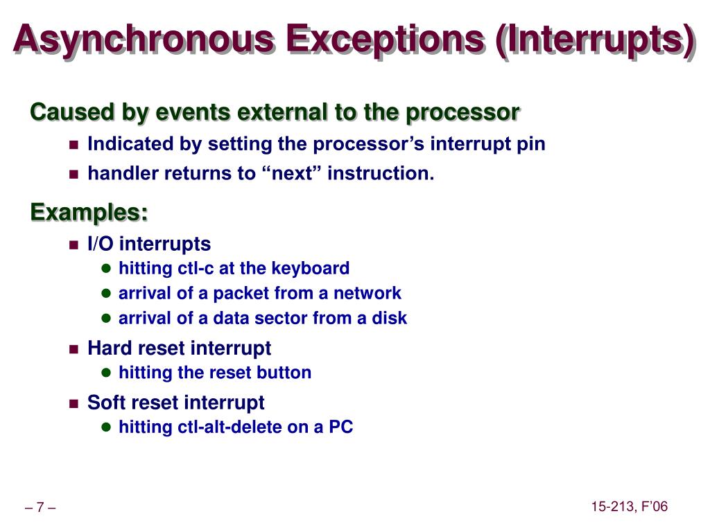 Asynchronous Exceptions (Interrupts) • Caused by events external to the processor • Indicated by setting the processor’s interrupt pin • handler returns to “next” instruction. • Examples: • I/O interrupts • hitting ctl-c at the keyboard • arrival of a packet from a network • arrival of a data sector from a disk • Hard reset interrupt • hitting the reset button • Soft reset interrupt • hitting ctl-alt-delete on a PC