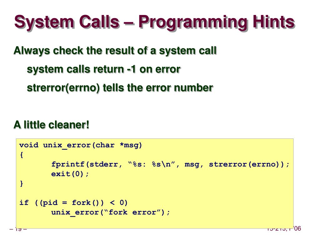 System Calls – Programming Hints • Always check the result of a system call • system calls return -1 on error • strerror(errno) tells the error number • A little cleaner! void unix_error(char *msg) { fprintf(stderr, “%s: %s\n”, msg, strerror(errno)); exit(0); } if ((pid = fork()) < 0) unix_error(“fork error”);