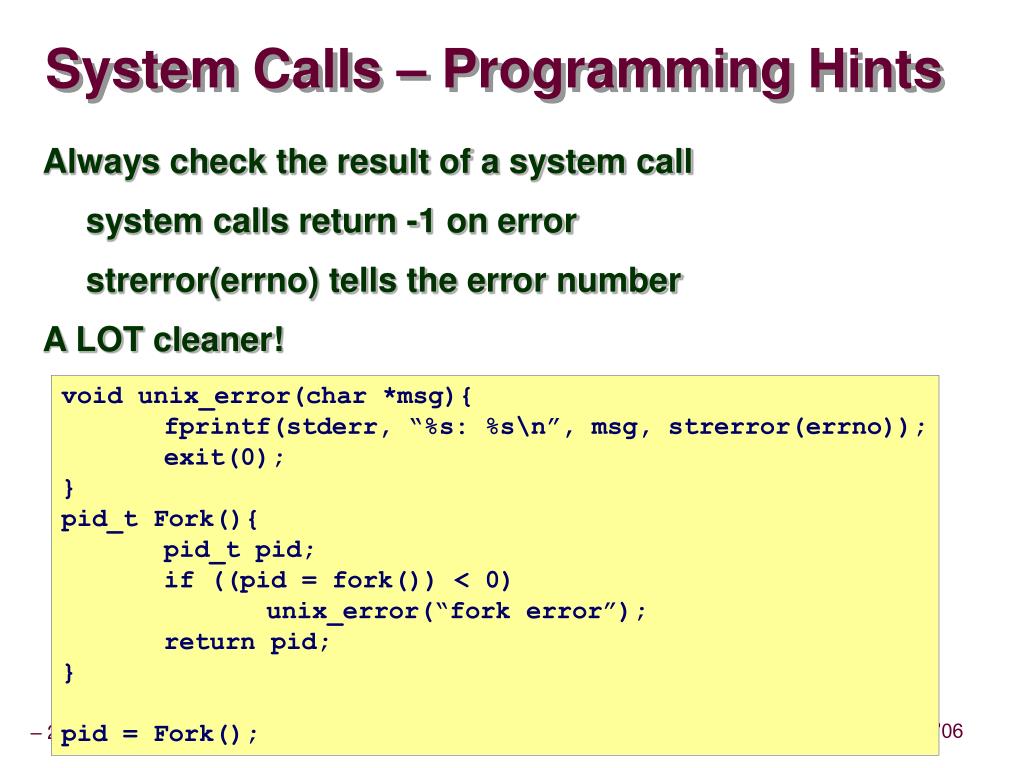 System Calls – Programming Hints • Always check the result of a system call • system calls return -1 on error • strerror(errno) tells the error number • A LOT cleaner! void unix_error(char *msg){ fprintf(stderr, “%s: %s\n”, msg, strerror(errno)); exit(0); } pid_t Fork(){ pid_t pid; if ((pid = fork()) < 0) unix_error(“fork error”); return pid; } pid = Fork();