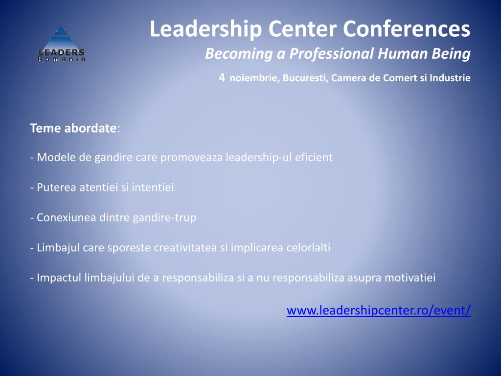 Leadership Center Conferences Becoming a Professional Human Being4noiembrie, Bucuresti, Camera de Comert si Industrie Temeabordate: - Modelede gandire care promoveaza leadership-uleficient - Putereaatentieisiintentiei - Conexiuneadintregandire-trup - Limbajulcare sporestecreativitateasiimplicareacelorlalti - Impactullimbajului de a responsabilizasi a nu responsabilizaasupramotivatiei www.leadershipcenter.ro/event/