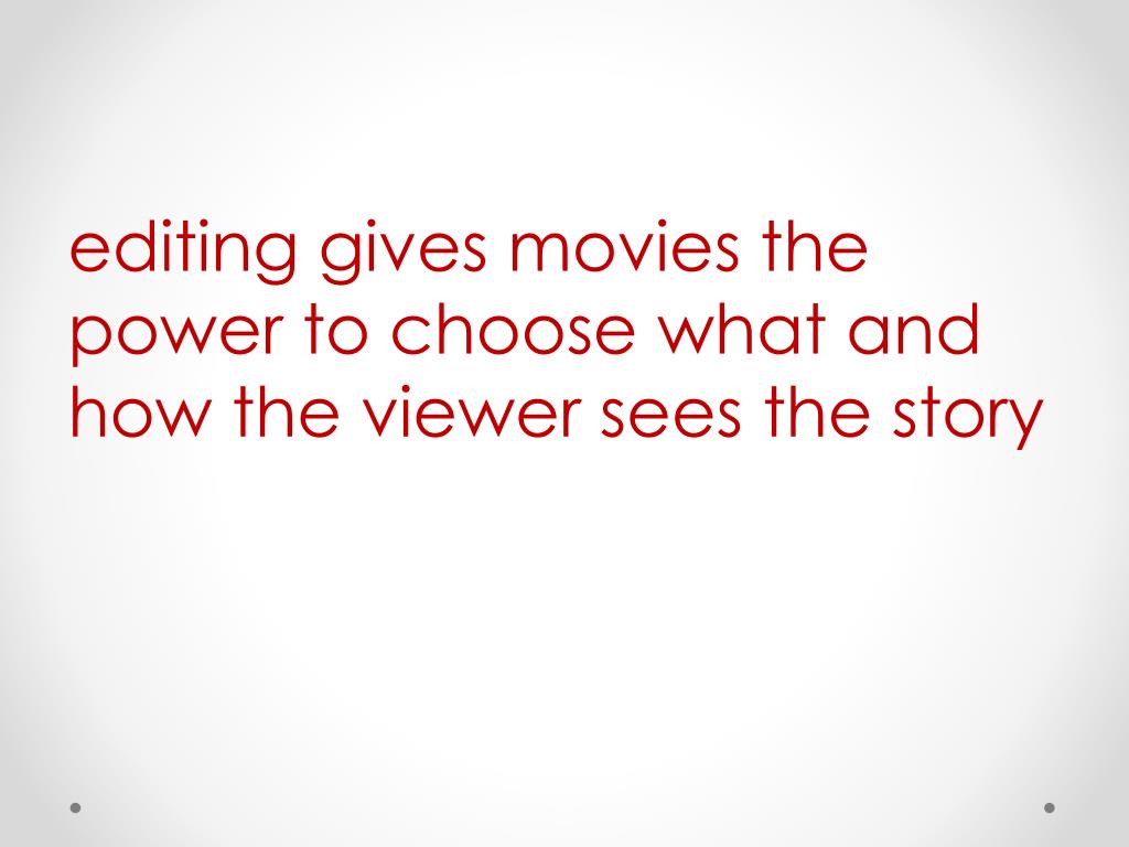 Looking at Movies. virtually every movie employs a narrative . cultural differences affect how stories/narratives are presented. editing gives movies the power to choose what and how the viewer sees the story. in order understand a movie, there needs to be analysis .