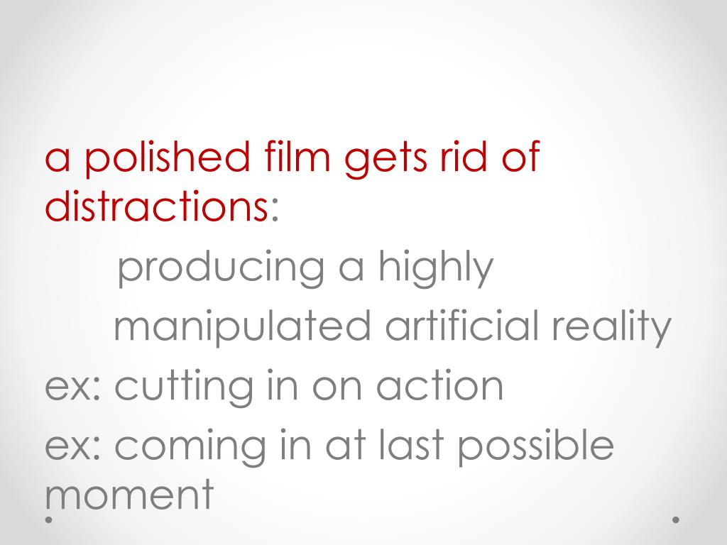 a polished film gets rid of distractions: producing a highly manipulated artificial reality ex: cutting in on action ex: coming in at last possible moment