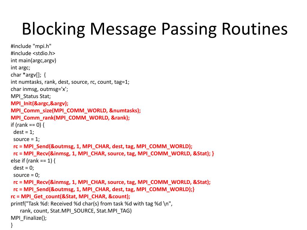 Blocking Message Passing Routines #include "mpi.h" #include <stdio.h> int main(argc,argv) int argc; char *argv[]; { int numtasks, rank, dest, source, rc, count, tag=1; char inmsg, outmsg='x'; MPI_Status Stat; MPI_Init(&argc,&argv); MPI_Comm_size(MPI_COMM_WORLD, &numtasks); MPI_Comm_rank(MPI_COMM_WORLD, &rank); if (rank == 0) { dest = 1; source = 1; rc = MPI_Send(&outmsg, 1, MPI_CHAR, dest, tag, MPI_COMM_WORLD); rc = MPI_Recv(&inmsg, 1, MPI_CHAR, source, tag, MPI_COMM_WORLD, &Stat); } else if (rank == 1) { dest = 0; source = 0; rc = MPI_Recv(&inmsg, 1, MPI_CHAR, source, tag, MPI_COMM_WORLD, &Stat); rc = MPI_Send(&outmsg, 1, MPI_CHAR, dest, tag, MPI_COMM_WORLD);} rc = MPI_Get_count(&Stat, MPI_CHAR, &count); printf("Task %d: Received %d char(s) from task %d with tag %d \n", rank, count, Stat.MPI_SOURCE, Stat.MPI_TAG) MPI_Finalize(); }