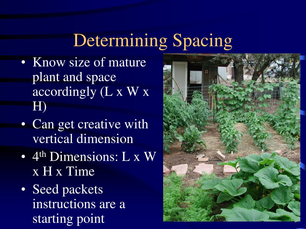 Determining Spacing • Know size of mature plant and space accordingly (L x W x H) • Can get creative with vertical dimension • 4th Dimensions: L x W x H x Time • Seed packets instructions are a starting point