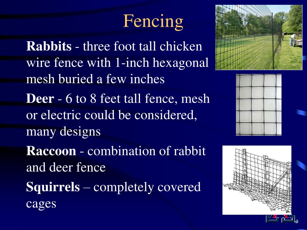 Fencing Rabbits - three foot tall chicken wire fence with 1-inch hexagonal mesh buried a few inches Deer - 6 to 8 feet tall fence, mesh or electric could be considered, many designs Raccoon - combination of rabbit and deer fence Squirrels – completely covered cages