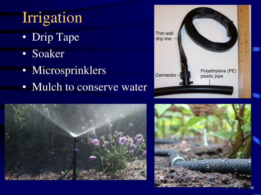 Irrigation • Drip Tape • Soaker • Microsprinklers • Mulch to conserve water